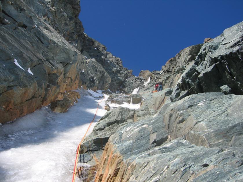 První dvě jištěné délky jsou v ledu (50 a pak poctivých 60 metrů). Gobo vytáhne první, nalézám, po asi 12 metrech hned u prvního šroubu mám dojem, že mě neudrží nohy, kroutím se tam a snažím se nějak vymyslet, jak nestát chvíli na předních hrotech. Řešení nenalézám a tak raději co nejrychleji běžím za Gobem. Dofuním ke štandu, cvakám se a jsem rád že jsem tam. Gobo opět vyráží, když se ptá, kolik ještě lana, zbývá asi 8 metrů. Něco tam špekuluje, pak se dozvidám, že chtěl udělat štand, ale pak si všimnul prvního borháku, tak už dolezl k němu, lano vyšlo úplně přesně. Jsme tedy už v poslední, mixové a vyborhákované části a po třech krátkých, maximálně trojkových, asi 40 metrových délkách, dolézáme do sedélka. Tam už je poměrně rušno, po normálce přes Klein Glockner.