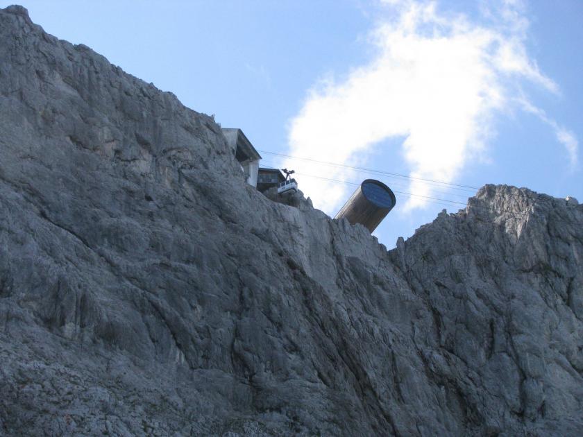 Stařičká lanovka Karwendelbahn vyjede na vrcholky docela svižně, tak po vlastních to půjde určitě taky dobře. Na chatu Mittenwalder Hütte dorážíme od parkoviště za hodinu a něco - je asi v jedné třetině lanovky. Pro lenochody - u chaty lanovka nestaví. Sice v chatě mají luxusní odpad napojený až na veřejnou síť v Mittenwaldu, ale pitnou vodu ne. Tak pijeme celé 3 dny alespoň Keinovu pitnou vodu (Kein trinkwasser) a mittenwaldské pivo.