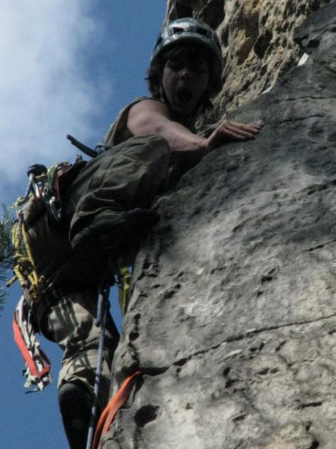 Po svačině se Martin vrhá na Daliborku do Výří cesty. Nějací klasičtěji vyhlížející strejdové přiběhli zrovna, když jsme se navazovali, a že prej to vezmou variantou přes předskalí. Nakonec si přeci jen nechali vysvětlit, že varianty většinou končí tou samou cestou, ale i tak byli nahoře stejně rychle jako my, jen to vzali přes (nesoutěžní) Mravenčí cestu. Hold nejde-li to dveřmi... Normálka na Knihu je pro klasického hustce, jako je Martin, procházkou anglickým parčíkem. Já za ním bohužel zjišťuji, že lezení v tílku má i své nevýhody, zvlášť když se jedná o dvacetimetrovou spáru.
