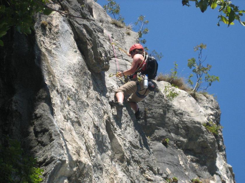 Až na první den lezu celou dobu s Dejvem. Dejv převzal odborný dozor naučit mne jeho oblíbené kratochvíli a to hákování. Jsem učenlivý žák a občas se od štandu směrem dolů snažím něco málo pochytit, leč vím - lehké to nebude. Ovšem poté co jsme shlédli, hákovací umění německých horolezců i sám Dejv uznává a podotýká "hrdinové". Zatímco někdo má z dobře háknutého místa radost, Suzán je z háknutých délek smutná.