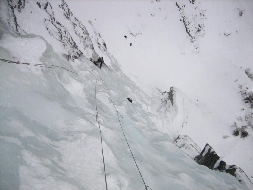 Co vám to budu dlouho popisovat. Bylo to parádní. Je pravdou, že předpověď počasí měla mírnou odchylku a bylo větší teplo, než jsme doufali. Úseky kvalitního ledu nám čas od času vystřídali úseky křehkého vysoce lámavého a špatně zajistitelného ledu, leč i přes tuto skutečnost, celou akci hodnotíme kladně. Doufám, že i Dejv nemyslel vážně, když stále mumlal "Co tady proboha v tom marastu dělám" a že vícekrát na ledy nevyrazí. Tímto se mu ještě jednou omlouvám, že jsem na něj celou dobu házel ledosračky. Maťa má pochvalu za pěknou rozlámanou délku, kterou Maťovi vytáhla - obětavé to děvče.