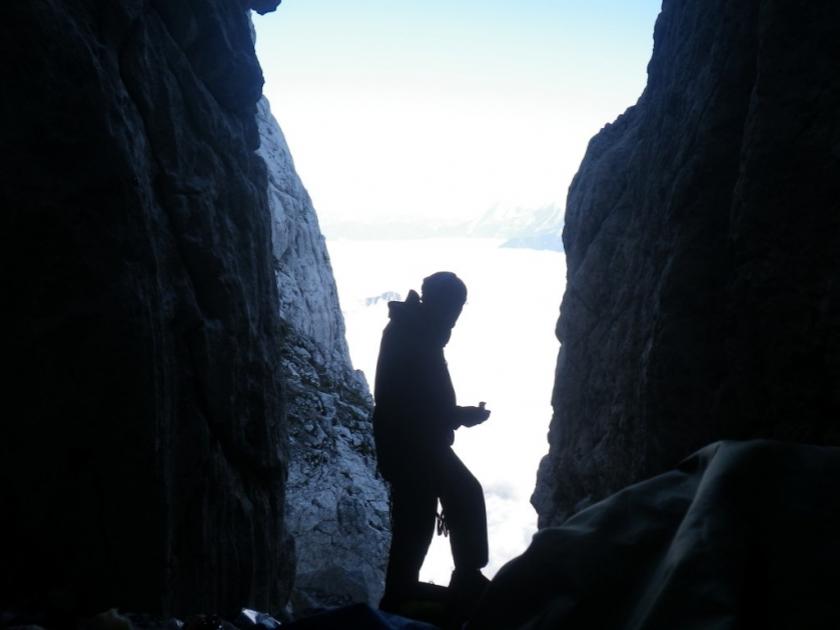 Tak, neplánovaný bivak, je vůbec vzdělání horolezce kompletní, dokud ho nezažije? V tomhle případě je bivak luxusní. Pěkně chráněni v tři metry širkém suťovém žlabu na vybagrovaných plošinkách to ujde, dokonce i na nějakou tu hodinku se podaří oko zamhouřit. V údolí se válí inverze, a tak nám není ani velká zima. Jen ta voda trochu chybí.