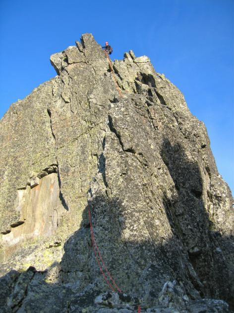 Takže k prvnímu štandu spíše běžím než lezu, jsem tam chvilku po dolezu prvního, kde se od něj dovídám, že stejně slaní, že se na to nějak necítí. Nám se leze dobře. Sluníčko, rozhledy, cesta není těžká, takže za dvě a půl hodinky od nástupu jsme na hřebeni. Nahoře u lanovky dáváme nějakou tu müsli tyčku, dlouho se nezdržujeme, protože máme ještě namířeno na hřeben Vidlových věží.