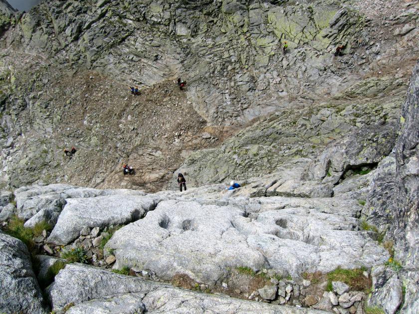 Chceme sestoupit do Teryho kuloáru po řetězěch, které tu prý někde jsou. Dost dlouho je ale hledáme a vystupujeme zbytečně asi 200 výškových metrů nad ně, abychom je pak nakonec našli, ale jedině díky dvojce, kterou u nich vidíme. Jsou celkem dobře schované, i když u nich je mužík, kterého jsme předtím nějak přehlédli. Kousek nad řetězy je i slanění, ale volíme raději řetězy, bude to jistě rychlejší.