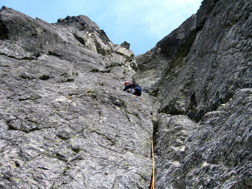 Za pár minut jsme tedy konečně v kuloáru, vystoupáme až pod nástup Hokejky. Nějaká trojka se tam pokouší sundat kouslé lano. Taky hodina už dost pokročila, tím, jak jsme se motali a hledali ty řetězy. Je už po jedenácté a tak od Hokejky upouštíme a stoupáme ještě kousek výš pod Stanislawského(V). Tu je nalezená nějaká dvojka v první délce, čeká tu další dvojka. Nějak jim to ale nejde, první leze asi 10 metrů za dobu než se připravíme, takže Gobo vyráží s tím, že je musíme předběhnout.