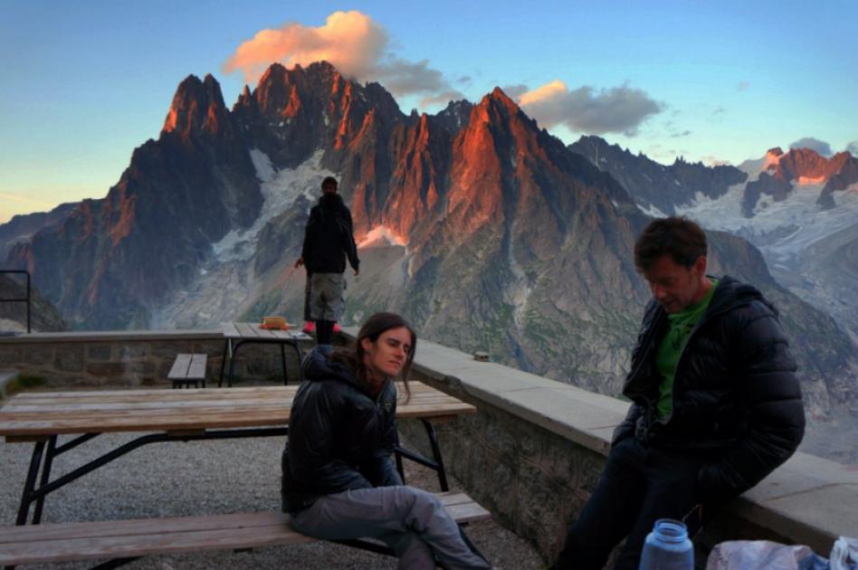 tak už kurva svítá? (v pozadí severní stěna Grandes Jorasses se svým legendárním Walkrovým pilířem)