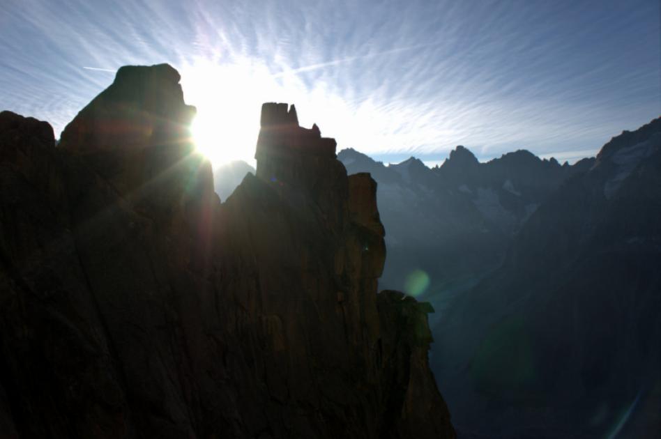 hups, a už se leze na Grepon, svítání již pár set metrů nad ledovcem... slunce prosvítá zkrz Tour Rouge