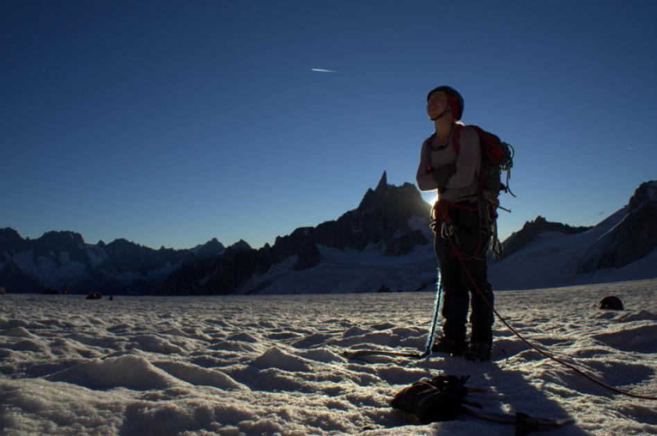 tak už kurva svítá? (v pozadí severní stěna Grandes Jorasses se svým legendárním Walkrovým pilířem)