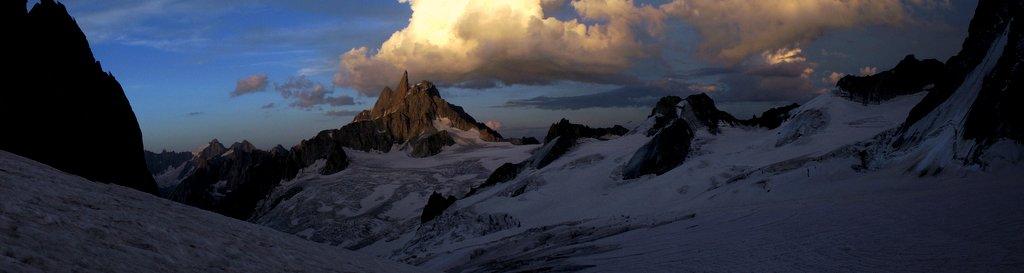 Another world (vlevo Dent du Geant, v údolí pod ním Séracs du Géant nad kterým se někde na skále choulí Refuge du Requin a nad ním Dent du Requin, v pozadí za Vallée Blanche je nejspíš vidět Helbroner)