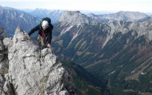 Lezli jsme těsně pod 2000 metrů nad mořem, počasí bylo dva dni ideální a nadšení jsme byli hlavně z hřebene Fledermausgrat na Griesmauer uzavírajíc údolí nad Leobenem. Jedenáct délek byl těžký od dvojky do čtyřky a sestup byl pěšky po suti.