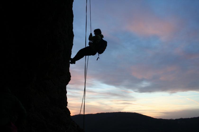 Sakal zmizel, jen co jsme se všichni dostali do jeskyně. Lokomotiva Beroun slanila hned po nich. My slanili už za tmy. Po nás se do jeskyně propasírovali skrz plazivku jeskynáři z Geospeleos.