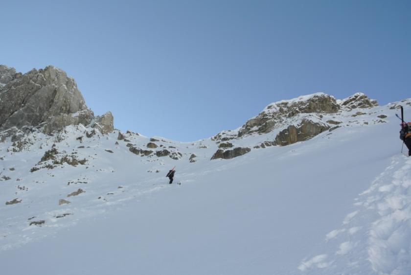 Pak už je to jen nahoru na lyžích a nějakou tu poslední stovku metrů do sedla na mačkách. Opalovačka, pívečko, sundat pásy a hurá dolů v prašanu co zůstal schován ve stínu. Pěkná krátká tůra. Ideální na zimní dny. Pokud by měl někdo chuť na vrchol, pak ať se připraví na lezení v obtížnostech II-III v ne zrovna pevné a čitelné skále.