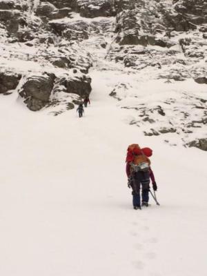 Další den to bylo dobrý. Šli jsme lízt, ale prvně ... snídaně. Věřil bys, že existují lidi, co snídají makrelu s makovou buchtou? No fakt, já tam jednoho viděl. A pak jsme vyrazili. Pípák už bezpečně ovládám, takže si vesele bliká a postupně se prokluzujeme nahoru směrem na kopec. Doleva, tam, kde by svítilo sluníčko už od rána, kdyby nebylo zataženo. Příjdem tam a hej! Super! Jsou tam lidi na povídání. Tak postupně vytahujeme matroš, Gobo čůrá, Feu utekla za roh. Po chvilce čekání vidím divoký páčo, který se postupně zvětšuje do obrysů Koviho. Super, rozproudí se uvadající konverzace. Ale oni někam odcházejí. No neva, stejně prý už mám lízt. Tak lezu. Chvilku to bolí, pak to jde a pak zas nejde. Cepíny jsou nanic, žábuju. Pak zjistím, že ty cepíny jsou vlastně fajn. Už nežábuju. Zahnem kamsi mimo a pak už NV. Sním gumovýho medvídka (tyjo, já si pamatuju kravin), co mi dává Anička. Pak se jde dolů. Za Aniččinou lahví, která udělala fííííííí dolů. Sestup si nepamatuju, ale hlavně, že si pamatuju gumovýho medvěda. Došli jsme do chaty a fakt jsem to přežil! Super! Moje první cesta v zimě! Nezabil jsem se a všem jsem to hned měl potřebu říct. Kafe, večeře a Gobo-style.