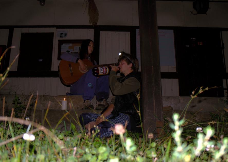 Po nějaké době si všimneme, že přes plot lezou nějaké postavy. Konečně - spřízněné duše přicházejí přidat se k naší tryzně! Jenom ale mlčky zapadnou do spacáků na opačném konci zápraží. Jsme smutní a taky to hned náležitě promítáme do našeho spjewu. Když už jim musíme lézt všemi tělesnými otvory, sebekriticky vyhodnotíme, že je čas to dnes vzdát, zhasneme svíčky a jdeme se vyspat do lesa.