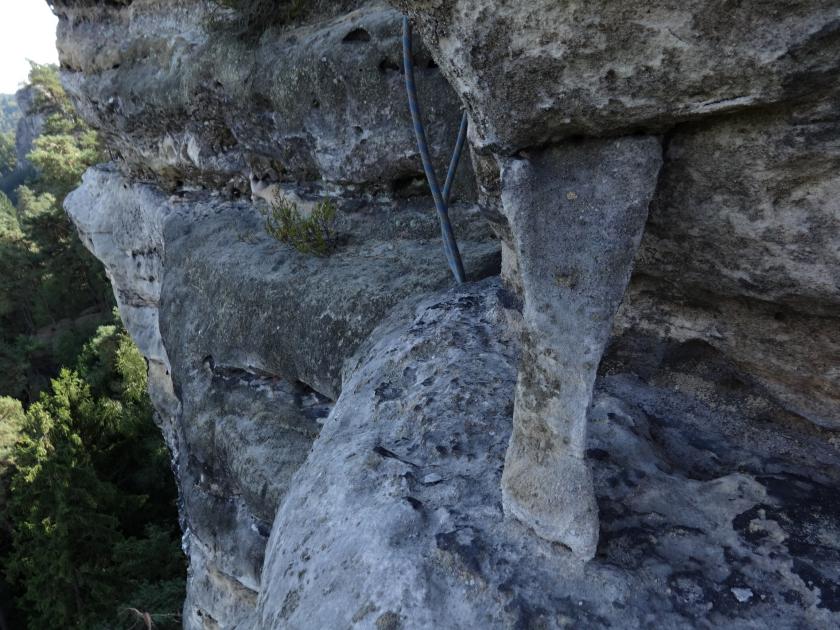 První zastávkou je věž poblíž Janovy vyhlídky, kde chci omrknout další Joskovu jeskyni; má to být ta, ze které skákal, když prchal před gestapem. Věž je ale rozložitá a jeskyně tu najdeme asi tři, takže si nejsme úplně jistí, která je ta pravá. Víťovi se mezitím zalíbí vysoká Údolní stěna (VI) s jedním kruhem, tak jdeme do ní. Cesta je dlouhá a až na křehčí části docela hezká a stojí za to minimálně kvůli výlezu na hranu "kulisy", kde se najednou ocitáte ve fantastické expozici. Při cvakání kruhu se Víťa ukáže být mistrem improvizace, když uprostřed stěny sestrojí šáhlo z expresky, šťáradla a koruny, Přemek Podlaha by měl radost. Další nová věž! Z vrcholovky zjišťujeme, že jsme tu letos teprve třetí, a to byla cesta ve Skalním muži a vedou sem hned dvě jedničky. Nahoře taky identifikujeme pravou jeskyni i s důvodem, proč jsem se sem sama bála. Naštěstí není doma, takže si ji shora pěkně v klidu prohlédneme. Je opravdu obrovská, z nepřístupné údolní strany otevřená, z druhé sem ústí jen úzké skalní okno. A ta hloubka dolů je tedy sakramentská.