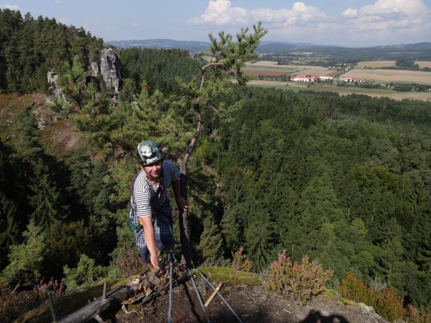 První zastávkou je věž poblíž Janovy vyhlídky, kde chci omrknout další Joskovu jeskyni; má to být ta, ze které skákal, když prchal před gestapem. Věž je ale rozložitá a jeskyně tu najdeme asi tři, takže si nejsme úplně jistí, která je ta pravá. Víťovi se mezitím zalíbí vysoká Údolní stěna (VI) s jedním kruhem, tak jdeme do ní. Cesta je dlouhá a až na křehčí části docela hezká a stojí za to minimálně kvůli výlezu na hranu "kulisy", kde se najednou ocitáte ve fantastické expozici. Při cvakání kruhu se Víťa ukáže být mistrem improvizace, když uprostřed stěny sestrojí šáhlo z expresky, šťáradla a koruny, Přemek Podlaha by měl radost. Další nová věž! Z vrcholovky zjišťujeme, že jsme tu letos teprve třetí, a to byla cesta ve Skalním muži a vedou sem hned dvě jedničky. Nahoře taky identifikujeme pravou jeskyni i s důvodem, proč jsem se sem sama bála. Naštěstí není doma, takže si ji shora pěkně v klidu prohlédneme. Je opravdu obrovská, z nepřístupné údolní strany otevřená, z druhé sem ústí jen úzké skalní okno. A ta hloubka dolů je tedy sakramentská.