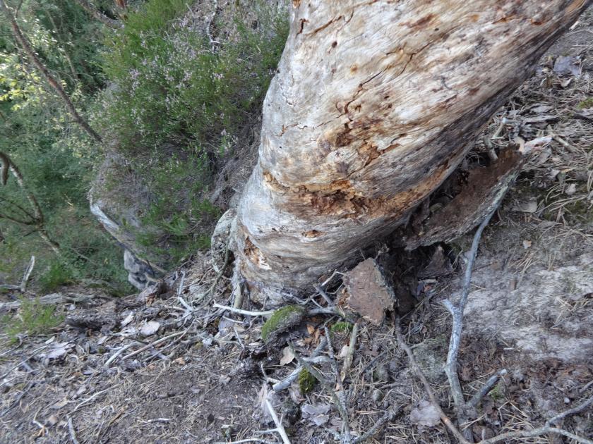 My naštěstí před nikým neprcháme, takže bychom dolů raději než sebevražedným skokem jedničkovou sestupovkou, jak jsme si to přečetli v průvodci, ale jaksi se nám nedaří ji najít. Na řadu tedy přichází varianta strom a Víťovi padne do oka jeden už celkem zasloužilý buk. Moc se mi nezdá, ale Víťa vypadá odhodlaně a než se stačím rozmyslet, jestli bude výhodnější jet první (strom se jen načne a vykotlá se až s Víťou) nebo druhá (to jestli má spadnout hned), sedá do slanění a mizí za hranou. No, tentokrát á bylo správně. Strom sice nevypadá, že by se chtěl zrovna vykotlat, ale Víťa ho "načne" vcelku slušně. Bezmocně sleduju, jak se lano zařezává čím dál hloubš do stromu a krájí ztrouchnivělé dřevo jako máslo. Naštěstí než stačí Víťa dřevorubeckou práci dokončit, je dole. Hm, tak tudy už asi nesjedu. Taky se objevuje vrtulník a hrozně dlouho krouží nad Dračkama, kde poblíž nakonec i dosedá. Doufám, že si neletí pro nikoho od nás... Než se mi podaří najít nějaký strom v lepší kondici, Víťa nachází zezdola sestupovku a přilézá mi na pomoc. Ještě mu ukážu, co vyřezal, a pak už se oba skutálíme jedničkou k batohům.