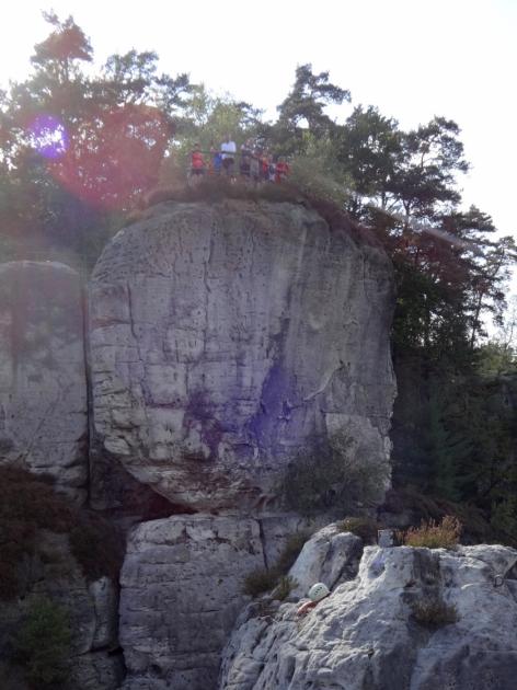 První zastávkou je věž poblíž Janovy vyhlídky, kde chci omrknout další Joskovu jeskyni; má to být ta, ze které skákal, když prchal před gestapem. Věž je ale rozložitá a jeskyně tu najdeme asi tři, takže si nejsme úplně jistí, která je ta pravá. Víťovi se mezitím zalíbí vysoká Údolní stěna (VI) s jedním kruhem, tak jdeme do ní. Cesta je dlouhá a až na křehčí části docela hezká a stojí za to minimálně kvůli výlezu na hranu "kulisy", kde se najednou ocitáte ve fantastické expozici. Při cvakání kruhu se Víťa ukáže být mistrem improvizace, když uprostřed stěny sestrojí šáhlo z expresky, šťáradla a koruny, Přemek Podlaha by měl radost. Další nová věž! Z vrcholovky zjišťujeme, že jsme tu letos teprve třetí, a to byla cesta ve Skalním muži a vedou sem hned dvě jedničky. Nahoře taky identifikujeme pravou jeskyni i s důvodem, proč jsem se sem sama bála. Naštěstí není doma, takže si ji shora pěkně v klidu prohlédneme. Je opravdu obrovská, z nepřístupné údolní strany otevřená, z druhé sem ústí jen úzké skalní okno. A ta hloubka dolů je tedy sakramentská.