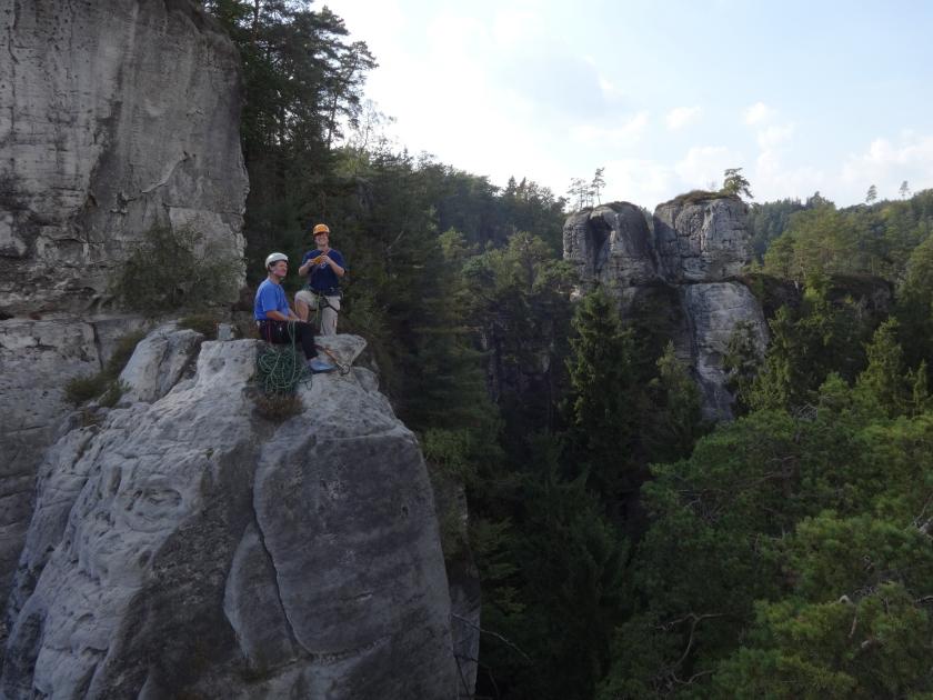 První zastávkou je věž poblíž Janovy vyhlídky, kde chci omrknout další Joskovu jeskyni; má to být ta, ze které skákal, když prchal před gestapem. Věž je ale rozložitá a jeskyně tu najdeme asi tři, takže si nejsme úplně jistí, která je ta pravá. Víťovi se mezitím zalíbí vysoká Údolní stěna (VI) s jedním kruhem, tak jdeme do ní. Cesta je dlouhá a až na křehčí části docela hezká a stojí za to minimálně kvůli výlezu na hranu "kulisy", kde se najednou ocitáte ve fantastické expozici. Při cvakání kruhu se Víťa ukáže být mistrem improvizace, když uprostřed stěny sestrojí šáhlo z expresky, šťáradla a koruny, Přemek Podlaha by měl radost. Další nová věž! Z vrcholovky zjišťujeme, že jsme tu letos teprve třetí, a to byla cesta ve Skalním muži a vedou sem hned dvě jedničky. Nahoře taky identifikujeme pravou jeskyni i s důvodem, proč jsem se sem sama bála. Naštěstí není doma, takže si ji shora pěkně v klidu prohlédneme. Je opravdu obrovská, z nepřístupné údolní strany otevřená, z druhé sem ústí jen úzké skalní okno. A ta hloubka dolů je tedy sakramentská.