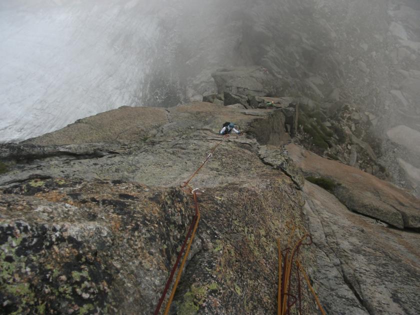 No a čo sme nevyliezli? Nakoniec viac ako vyliezli. Hneď prvý deň ráno prší ale prestáva, tak o 11h nastupujeme do pôvodnej varianty Les point des sourpis a prekvapivo zisťujeme, že to nestíhame. Po tretej dĺžke zlaňujeme dole. Na druhý sme to ale doliezli, viď vyššie. Pod asi najľahšiu z často lezených ciest v okolí - Magie d'Orient sme sa nedostali. Odradil nás rozpraskaný ľadovec. No a posledný deň pytlíme krásnu Amazoniu. Tvrdá klasifikácia, dlhšie odlezy, únava, psychická či fyzická spôsobili, že zo 6-tej dĺžky zlaňujeme dole. Ale kvôli mokrej platni a jemnému sokolíčkovi v prvej dĺžke, "smíchovskej" špáre s len dvomi použitelnými friendami v tretej dĺžke, prísnej 5c dĺžke s vklínencami po metri a ďalšími krásnymi dĺžkami sa tam určite vrátime a odpytlíme...
