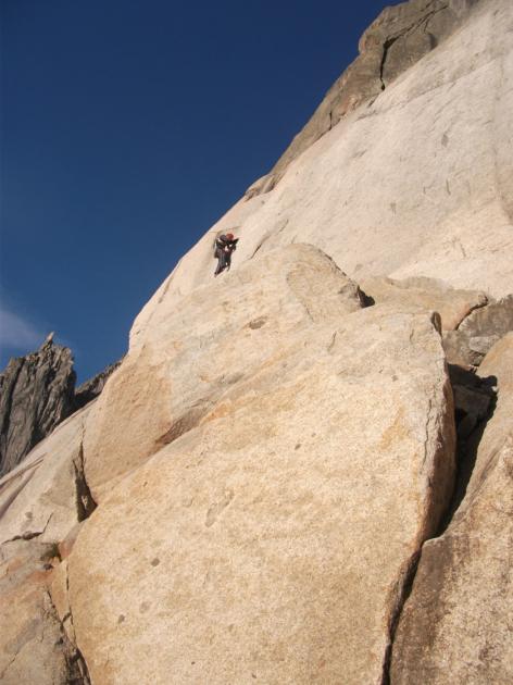No a čo sme nevyliezli? Nakoniec viac ako vyliezli. Hneď prvý deň ráno prší ale prestáva, tak o 11h nastupujeme do pôvodnej varianty Les point des sourpis a prekvapivo zisťujeme, že to nestíhame. Po tretej dĺžke zlaňujeme dole. Na druhý sme to ale doliezli, viď vyššie. Pod asi najľahšiu z často lezených ciest v okolí - Magie d'Orient sme sa nedostali. Odradil nás rozpraskaný ľadovec. No a posledný deň pytlíme krásnu Amazoniu. Tvrdá klasifikácia, dlhšie odlezy, únava, psychická či fyzická spôsobili, že zo 6-tej dĺžky zlaňujeme dole. Ale kvôli mokrej platni a jemnému sokolíčkovi v prvej dĺžke, "smíchovskej" špáre s len dvomi použitelnými friendami v tretej dĺžke, prísnej 5c dĺžke s vklínencami po metri a ďalšími krásnymi dĺžkami sa tam určite vrátime a odpytlíme...