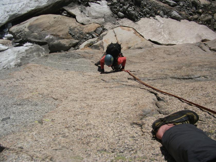 No a čo sme nevyliezli? Nakoniec viac ako vyliezli. Hneď prvý deň ráno prší ale prestáva, tak o 11h nastupujeme do pôvodnej varianty Les point des sourpis a prekvapivo zisťujeme, že to nestíhame. Po tretej dĺžke zlaňujeme dole. Na druhý sme to ale doliezli, viď vyššie. Pod asi najľahšiu z často lezených ciest v okolí - Magie d'Orient sme sa nedostali. Odradil nás rozpraskaný ľadovec. No a posledný deň pytlíme krásnu Amazoniu. Tvrdá klasifikácia, dlhšie odlezy, únava, psychická či fyzická spôsobili, že zo 6-tej dĺžky zlaňujeme dole. Ale kvôli mokrej platni a jemnému sokolíčkovi v prvej dĺžke, "smíchovskej" špáre s len dvomi použitelnými friendami v tretej dĺžke, prísnej 5c dĺžke s vklínencami po metri a ďalšími krásnymi dĺžkami sa tam určite vrátime a odpytlíme...