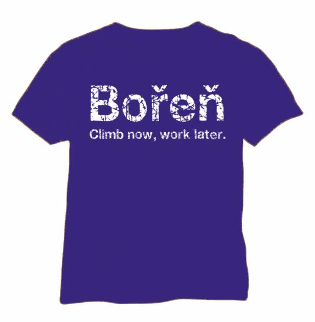 Před čtrnácti dny jsem na stěně zahlédl lezce v profláklém triku z Arca. Climb now, work later. Napadlo mě trika lehce zparodovat a první kopec, který mi přišel na myslel, byl(a)... BOŘEŇ. Ano, nejvelkolepější nepískovcová oblast v Česku si své triko zaslouží.