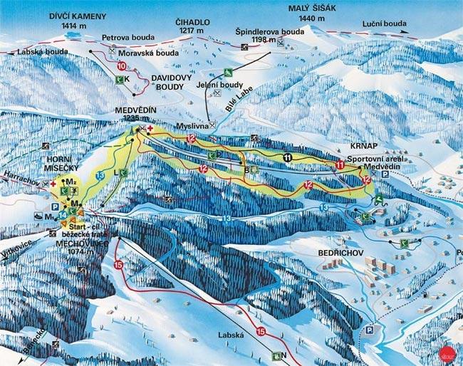Dole jsem si to neuvědomila, ale už na lanovce mi dochází divná věc. Je tu všude strašně málo lidí. Fronty vůbec žádné, lidí na svahu pomálu. Přitom sněhu je ještě dost. Počasí zachmuřené (proto jsme ani nefotili), vršek Medvědína je v hustém mraku, který během dne klesá, ale vítr je minimální a je jen lehce pod nulou.