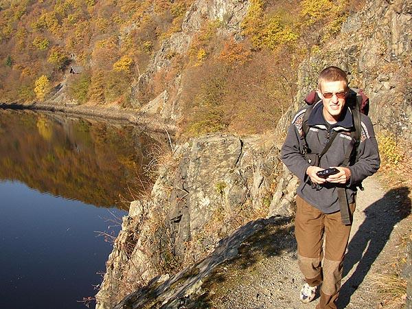 Až dole pod skálou mi došlo, že heslo: Zab si svého turistu! nebude nijak těžké naplnit hned několikanásobně. Protože nejsem znalcem horolezeckého slangu, slova Samej lokr ve mně vyvolávala pouze představu příliš silné turecké kávy, nicméně i při učení cizího jazyka zastávají odborníci názor, že je nejlepší poznat vše na vlastní kůži. Tohoto pravidla jsem se poctivě držela celý den. V lokrech jsme lezli, jistili, odpočívali, štandovali. V lokrech jsme dýchali, svačili, obědvali, pili a nenáviděli je. Z pětihodinového výstupu (na obhajobu týmu nutno poznamenat, že jsme lezli ve třech a že jeden z těch tří jsem byla já) si pamatuji nejlépe krkolomnou pozici v (cituji průvodce) Převislé spáře, kdy už nepomáhaly ani smyčky zavěšené Pionýrem, ani Honzovy dobré rady, ani Tomasovy pokusy rozveselit mě fotografováním z neméně hnusného místa o pár metrů vpravo. Nezbývalo než se kochat pohledem na romantické vltavské údolí, vycházející měsíc a zlátnoucí listí. Na to jsme totiž na vrcholu už neměli ani čas, ani dostatek světla.