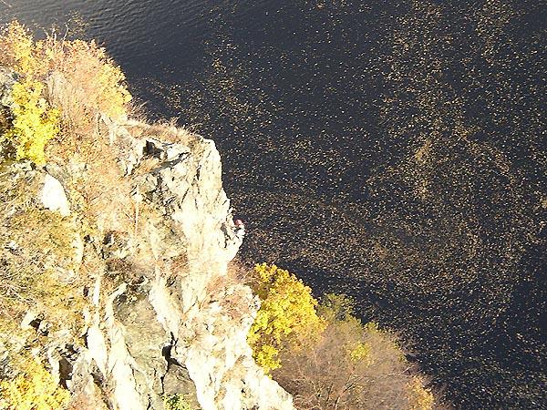 Až dole pod skálou mi došlo, že heslo: Zab si svého turistu! nebude nijak těžké naplnit hned několikanásobně. Protože nejsem znalcem horolezeckého slangu, slova Samej lokr ve mně vyvolávala pouze představu příliš silné turecké kávy, nicméně i při učení cizího jazyka zastávají odborníci názor, že je nejlepší poznat vše na vlastní kůži. Tohoto pravidla jsem se poctivě držela celý den. V lokrech jsme lezli, jistili, odpočívali, štandovali. V lokrech jsme dýchali, svačili, obědvali, pili a nenáviděli je. Z pětihodinového výstupu (na obhajobu týmu nutno poznamenat, že jsme lezli ve třech a že jeden z těch tří jsem byla já) si pamatuji nejlépe krkolomnou pozici v (cituji průvodce) Převislé spáře, kdy už nepomáhaly ani smyčky zavěšené Pionýrem, ani Honzovy dobré rady, ani Tomasovy pokusy rozveselit mě fotografováním z neméně hnusného místa o pár metrů vpravo. Nezbývalo než se kochat pohledem na romantické vltavské údolí, vycházející měsíc a zlátnoucí listí. Na to jsme totiž na vrcholu už neměli ani čas, ani dostatek světla.