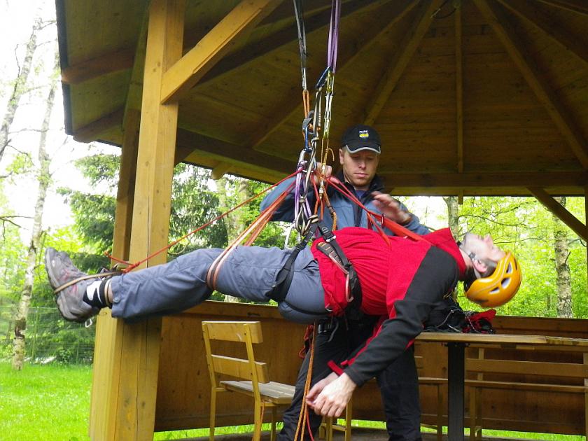 Tak jsem se zase zesměšnil jako každých pět let, kdy se dostavím na Blatiny na doškolení instruktorů. Zase po mě chtěl Martin Honzík, abych mu ukázal loďák jednou rukou. Tentokrát to ale dotáhnul ještě dál a postavil mě na hanbu, abych to furt zkoušel, než se to naučím. Až se mě zželelo Zdeňce, která mi pak ukázala, jak to učí nejmenší děti - jako že se vezme tác, uchopí lano na tác, překlopí tác a už to jako je hotové. ...no naštěstí jsem to už od neděle zase zapomněl, takže si nemusím dělat hlavu.