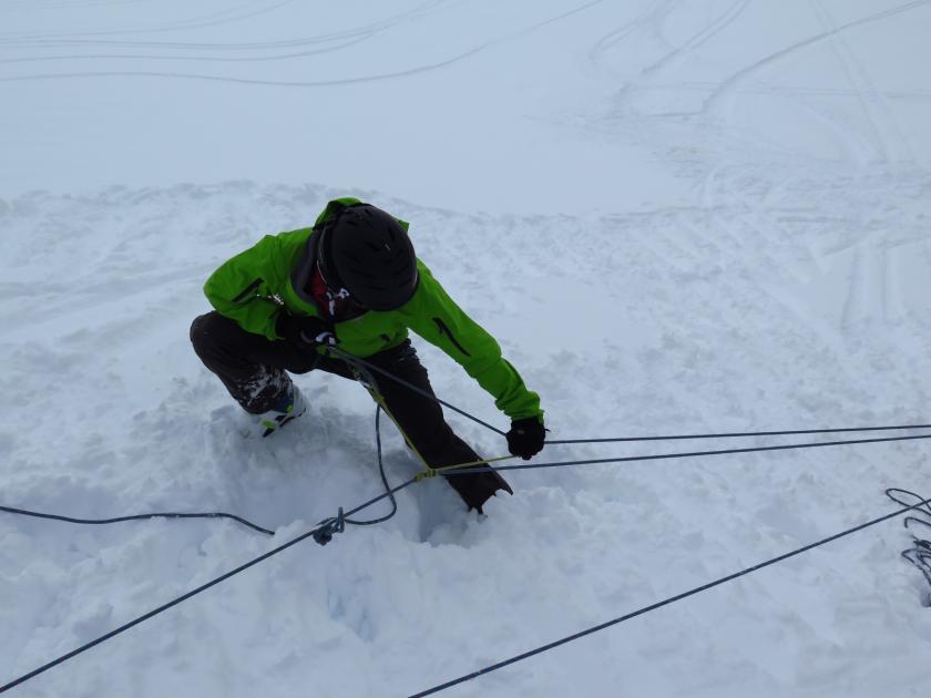 Vytahování z trhliny; štand z lyží, hmm fakt to drží. Jak se sakru propichuje ten loďák na dvojto, no asi to chtělo jestě pojistit, Víťa sjel o metr zpátky, ale nikdo si toho nevšiml Na propichování loďáků v krizový situaci kašlu, raději otevřu karabinu. Teď už jen propíchlý prusíkův uzel na jednom konci prusíku, motání, motání, ale jo. Kuba se ptá jestli záchranu nedělat jinak, než nám ukazovali, to si naběhl, teď ho v tom nechaj vykoupat, samozřejmě, že nedělat. Humanitní svině se opět dobře baví. Motání píchanejch prusíků před zraky lektrorů nikomu moc nejde: "Chlapi tohle přece máte dávno umět, kdo je z vás HAL?"