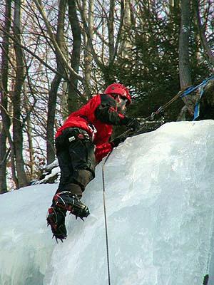 Slyším, jak lezou prvolezci, přemrzlý led se tříští pod kovovými zobáky jejich cepínů a hroty maček do něho vrážejí s velkým úsilím. Konečně přicházím na řadu. Snažím se poprvé zaseknout cepín do čistého ledu, ale úder se nedaří, špice odskakuje. Teprve sbírám zkušenosti. Konečně cepín zasekávám správně a já můžu popolézt o pár centimetrů a zakopnout i mačku do ledu. Ta drží, je to dobré. Pomalu postupuji vzhůru. Dvakrát lehce to nejde, ale pomalu se šinu nahoru. Občas mi cepín vypadne z ledu a někdy odtrhne do údolí i několikakilogramový kus nedržícího ledu.