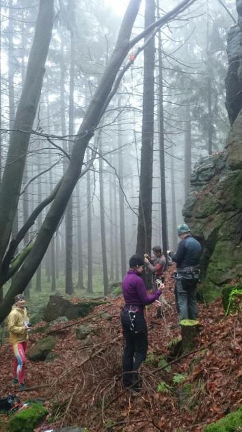 Odtud již přibíháme ke kontrole zakreslené na historické mapě. Míjíme Robina s Jančou, jak se vrací cvaknout kontrolu na skále. Jen zapsání do vrcholovky nestačí. Dalším zpestřením je přelanění rybníka, naštěstí bez koupání. Z lezeckých disciplín už chybí jen cvaknout kontrolu na slackline, přelézt klettersteig v koruně dubu a vyšplhat nebo vyprusíkovat po konopném laně. Na několik stromů jde dolézt bez lana.