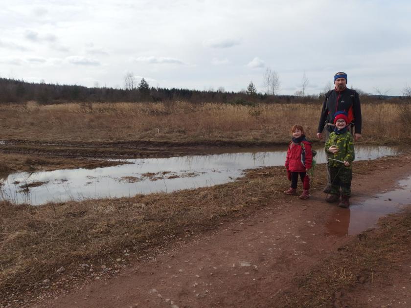 Asi v 10 hodin jsme vyšli po naučné stezce k bývalému dolu Barbora. Cestou jsme potkali jednu běžkyni a jednoho turistu. Dále po modré na Hrachoviště jsme potkali jen stromy, mechy, trávu, šišky,... a hlavně parádní veliké bahnité kaluže, ze ktrých měli děti obrovskou radost. Po žluté z Hrachoviště na Krejčovku již bez louží :-(, parádní les a skoro liduprázdno jen pán a paní s pejskama. Kolem 12 hodiny jsme od Krejčovky volně kráčeli směrem Na Hlínu, proti nám v dálce nějaký pán s vozíkem s dětmi. Za námi z podkopce se vynořila skupinka turistů. Tý jo, tolik lidí najednou. Pán s vozíkem se přiblížil. Koukám a říkám si vypadá jako Rybíz!? Je to Rybíz. "Čau Rybízi!" Má dva kluky 2,5 a 5 let. Se ženou bydlí v Příbrami. Dostali jsme vizitku na objevování Brd - portál o Brdech, pěšky, na kole, během...www.objevbrdy.cz.