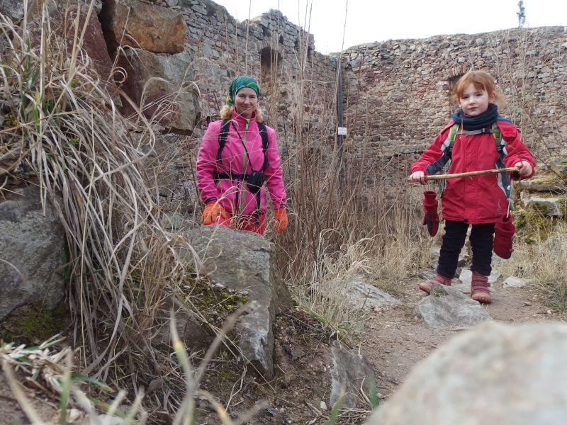 No a po rozloučení jsme po žluté asi po půlhodině dorazili na zříceninu hradu Valdek. Strašidla tam naštěstí nebyla, jak se obával Ríša, jen několik rodičů s malými dětmi. A také skupina tůristů s batohama, kteří nás míjeli, když jmse potkali vlese Rybíze. Valdek se nám líbil, Domi si tam našla kamaráda, jen byla chyba, že my jsme už šli z hradu k autu a končili výlet, kdežto kamarád teprve výlet začínal a šel (jel na odrážedle) opačným směrem po naší trase.
