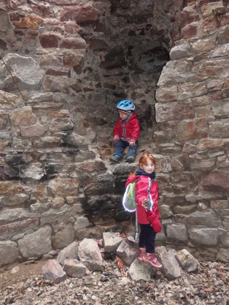 No a po rozloučení jsme po žluté asi po půlhodině dorazili na zříceninu hradu Valdek. Strašidla tam naštěstí nebyla, jak se obával Ríša, jen několik rodičů s malými dětmi. A také skupina tůristů s batohama, kteří nás míjeli, když jmse potkali vlese Rybíze. Valdek se nám líbil, Domi si tam našla kamaráda, jen byla chyba, že my jsme už šli z hradu k autu a končili výlet, kdežto kamarád teprve výlet začínal a šel (jel na odrážedle) opačným směrem po naší trase.