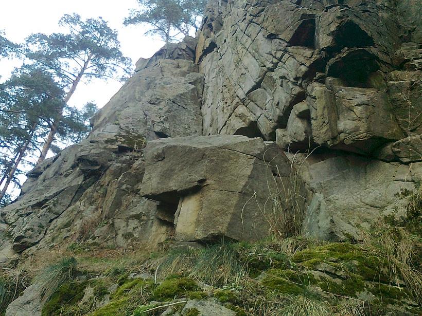 Po sobotní návštěvě mám dobrou zprávu: při hledání novějšího sektoru Starý svět, který není uvedený v průvodci Vltavská žula, jsme narazili na značky na stromech, které nás dovedly až na místo. Pravá část stěny je zvětralejší a v cestě na pravé hraně se Adamovi podařilo ušlápnout stokilový balvan. Následující cesty k velkému koutu vedou systémem spárek a odhadoval bych je kolem sedem, při čemž třetí cesta od prava začíná pekelným bouldrem, na který jsem neměl. Od kouta se ale situace mění - struktura skály a pevnost se radikálně zlepší. Cesta v koutě a nalevo od něj je tak za čtyři, další dvě cesty jsou parádní šestky plotnou a spárkami, vedle je další spára se skobou a za hranou pilířem jsme identifikovali podle popisu cest na Lezci 7+ a šestku Spadla klec. Cesty končí slaňovacím borhákem, stačí 40m lano a helma se sakra hodí.