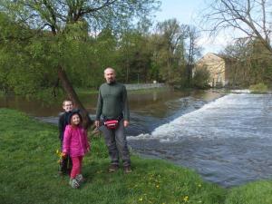 Autem jsme dojeli do Týnce nad Sázavou a vysadili zde Ríšu s tátou, kteří zde měli objednanou kánoi, pádla, neopren atd... Po deštích a sněžení bylo v Sázavě hodně vody, tak jsem se o ně trochu bála, aby to zvládli bez úhony. Nám s Dominikou táta raději naplánoval klidný pěší výlet z Pikovic, kde měli svoji cestu na kánoi končit i oni a kde jsme se měli sejít. V Týnci nás uvítala bouřlivá a kalná Sázava. Hned u prvního jezu bylo vidět, že loňké léto s trčícími balvany a šutry, kam se podíváš to tentokrát nebude. Trochu jsem znejistěla v obavách o syna, ale když jsem viděl jejich nadšení a skákání radostí, že to bude paráda a hezky to pojde, hned mě to přešlo. Navíc s jásáním se přidala i Dominička, která okamžitě chtěla jet s tátou a Ríšou a hrnula se do půjčovny pro pádlo. Přesvědčila jsem ji, že my jdeme na výlet!
