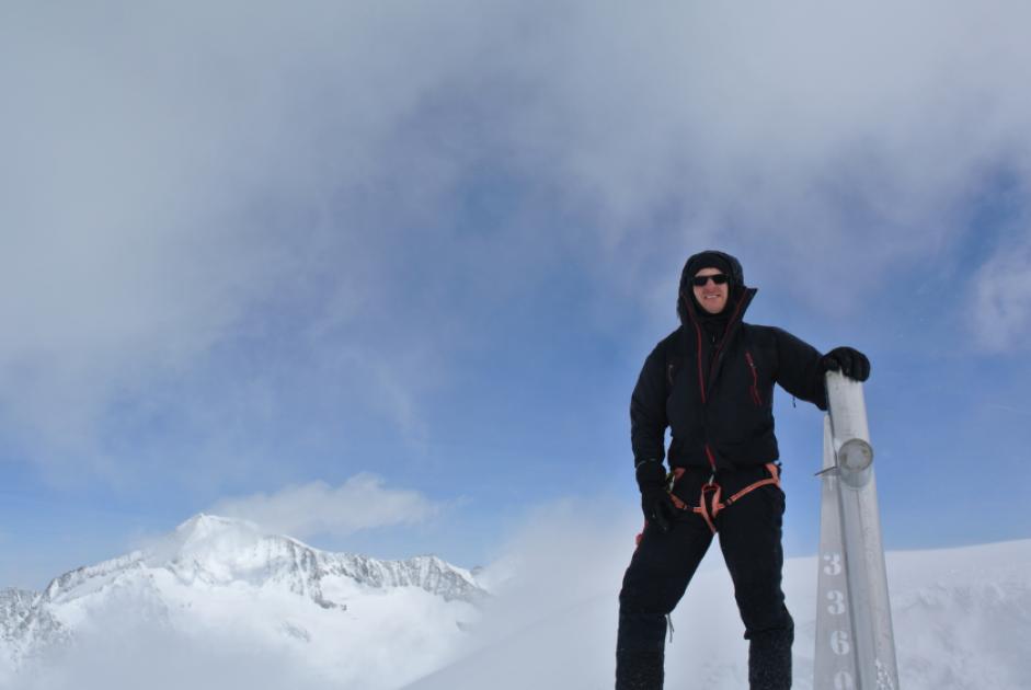 Na chvíli se ukáže přes údolí Venediger, tak rychle pár fotek. Sjezd je samozřejmě od kříže, tentokrát rovně dolů na ledovec, a následně ve stopách výstupu. Ti kteří si dobře prohlédnou při cestě nahoru ledovec a zejména skalky pod ním, mohou zvolit i odvážnější trasu. Máme kliku, mrak úplně zmizel, a tak si i sjezd užíváme na sluníčku. Místo výstupu proti bílé zdi je to příjemná změna.