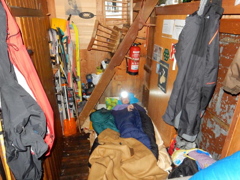 Spali jsme ve vlastních spacácích ve winterraumu. Reálně je to zádveří pro dva lidi na matraci. Nakonec jsme se tam docela dobře natlačili. Kdyby bylo nejhůř a spali bychom jako skrčenci v sedě, vešlo by se nás tam ještě o dva či tři lidi více.