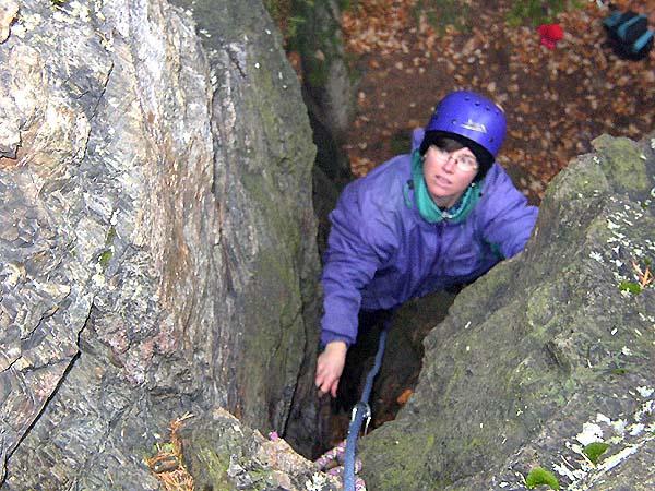Teplota je těsně nad nulou a při tom je ve vzduchu vlhko. Kámen tedy studí a necitlivé prsty to chtějí mít rychle za sebou. Na vrcholu k našemu údivu nacházíme bytelný slaňovací kruh, a tak spokojeně frčíme dolů. Při detailní obhlídce vidíme ve stěnách pár nových nýtů a zatlučených skob, obtížnosti cest okolo nich odhadujeme od šestky výš.