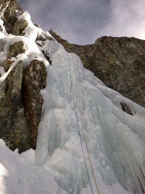 Po snídani vyrážíme, venku stále hmlisto, jasná obloha se nekoná. Za včerejšek napadlo asi 7cm prašanu, skialpové podmínky jsou parádní. My jsme tu ale kvůli ledům. Během lezení první délky se mraky začínají konečně protrhávat. Dolejzáme na konec druhé délky, svítí slunce a začíná se oteplovat, konečně. Další naše cesta je malinko mixová. Lezeme krátkou ukloněnou rampu, která protíná stěnu a kde led střídá tráva a skály. Včera jsme v ní viděli lezce a linie nás zaujala. Nakonec z toho byly dvě pěkné délky, šedesát a třicet metrů. Sestup volíme sousedním žlabem, kde vidíme stopy.