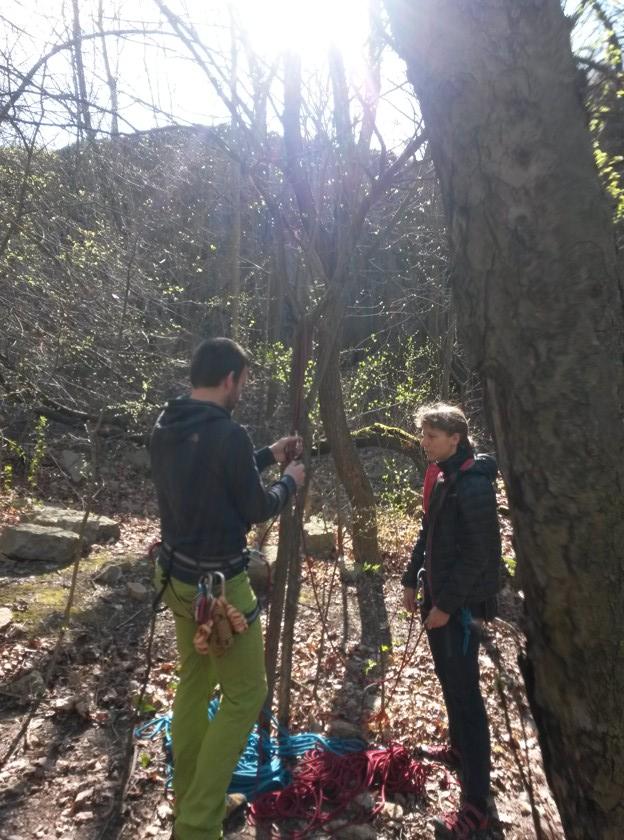 V sobotu Gobo s Davidem procvičili základní lanové techniky, když potřebujete zachránit parťáka a vytáhnout ho nahoru, nebo s ním slanit dolů. Na to jsou ideální Hlubočepy, protože skála je šikmá, hladká a dobře zajistitelná.