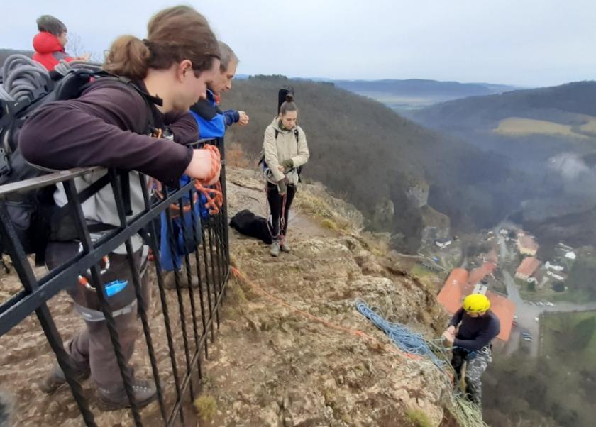 Ráno jsme se ve velmi hojném počtu setkali ve vlaku a protáhli se pěkně svižnou procházkou ze Srbska do Svatého Jána pod Skalou. Cestou to trochu klouzalo blátem, ale zdárně jsme dorazili až na vrchol ke kříži. Pokochali jsme se krásným výhledem, posilnili jsme se drobnou svačinou, přivázali jsme si na sedáky otýpky dřeva a začali jsme postupně slaňovat první délku do jeskyně. Celá tato akce zabrala poměrně dosti času a poslední z nás slanili až skoro za tmy. V jeskyni již hořel ohýnek, který tam zažehli kolegové nehumanitní lezci.