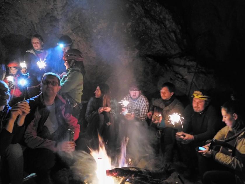 Ráno jsme se ve velmi hojném počtu setkali ve vlaku a protáhli se pěkně svižnou procházkou ze Srbska do Svatého Jána pod Skalou. Cestou to trochu klouzalo blátem, ale zdárně jsme dorazili až na vrchol ke kříži. Pokochali jsme se krásným výhledem, posilnili jsme se drobnou svačinou, přivázali jsme si na sedáky otýpky dřeva a začali jsme postupně slaňovat první délku do jeskyně. Celá tato akce zabrala poměrně dosti času a poslední z nás slanili až skoro za tmy. V jeskyni již hořel ohýnek, který tam zažehli kolegové nehumanitní lezci.
