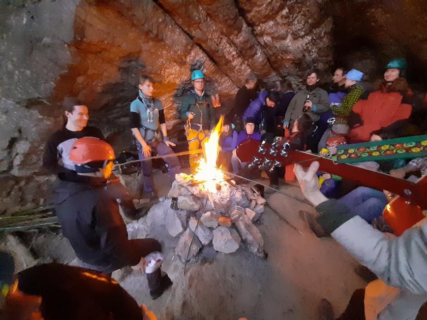 Ráno jsme se ve velmi hojném počtu setkali ve vlaku a protáhli se pěkně svižnou procházkou ze Srbska do Svatého Jána pod Skalou. Cestou to trochu klouzalo blátem, ale zdárně jsme dorazili až na vrchol ke kříži. Pokochali jsme se krásným výhledem, posilnili jsme se drobnou svačinou, přivázali jsme si na sedáky otýpky dřeva a začali jsme postupně slaňovat první délku do jeskyně. Celá tato akce zabrala poměrně dosti času a poslední z nás slanili až skoro za tmy. V jeskyni již hořel ohýnek, který tam zažehli kolegové nehumanitní lezci.