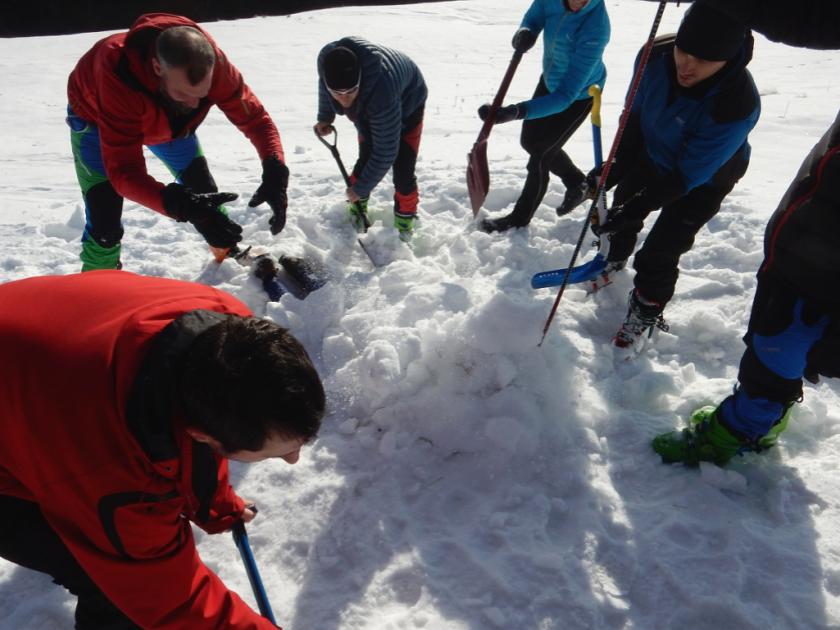 Jirka nás cvičí, jak vhrabat nešťastníka z laviny