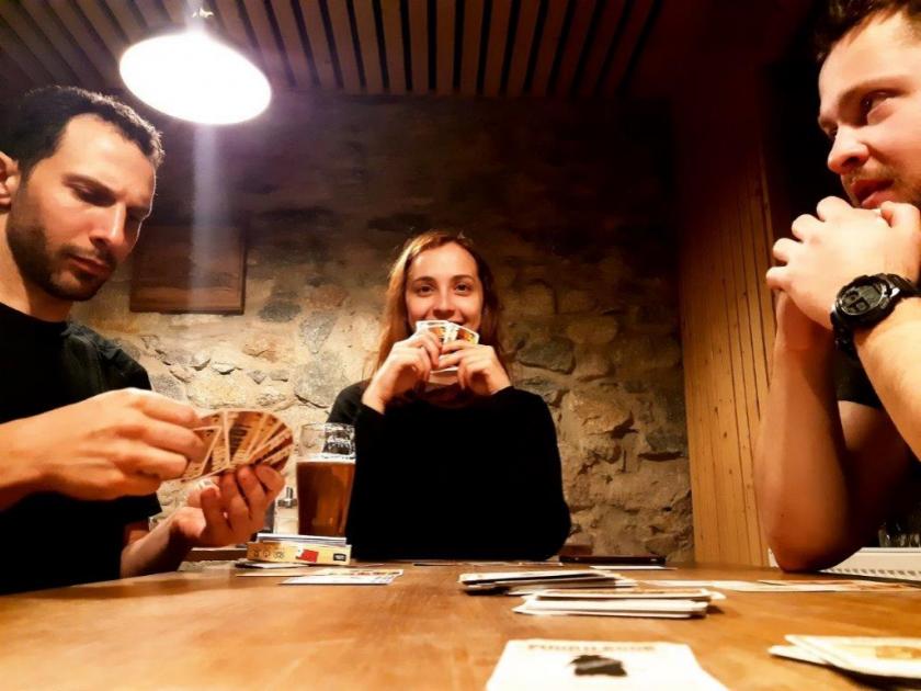 Nejvíc výstupů se konalo právě v neděli, protože v pondělí ráno se rozfoukal silný vítr a místy i sněžilo. Celou dobu bylo venku poměrně teplo, přes den teploty neklesly pod -10 stupňů. Michal s Honzou sice v pondělí podnikli odvážný výstup v závětří Žluté stěny, ale ostatní svůj program omezili na pochody v přefoukaném prašanu, kam až to půjde. Hodně jsme cvičili otáčení, když už to nešlo, a odhadování, jestli to ujede, nebo ne. Probíhalo i cvičné vrtání do ledu, bouldrování s cepíny, kopání sněhových profilů a jiné kratochvíle. Velikou záchranou pak byly hry na chatě. Nejvíc frčela Krycí jména a Bang. V úterý byla situace podobná.
