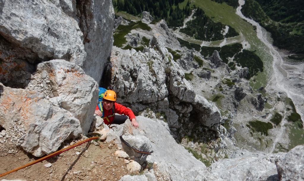 Ve čtvrtek ráno nám počasí opravdu přálo, slunce jako z pohlednice a nebe bez mráčku. Cesta k nástupům byla tak akorát, zhruba 400 výškových metrů. A tak jsme se do hodinky už vázali na lana a nastupovali do cest. Celá naše skupina se přiměřeně rozprostřela po celé jihozápadně stěně Kalblingu (2 196 mnm) a začali jsme stoupat k vrcholu. Cesty byly krásné, v těžších úsecích odjištěné a celkově byli všichni s prvním lezeckým dnem spokojení. Odpoledne jsme si mohli vychutnat krásný výhled z vrcholu kopce, až do Národního parku Gesäuse. Večer se opět nesl v duchu společného veselí.